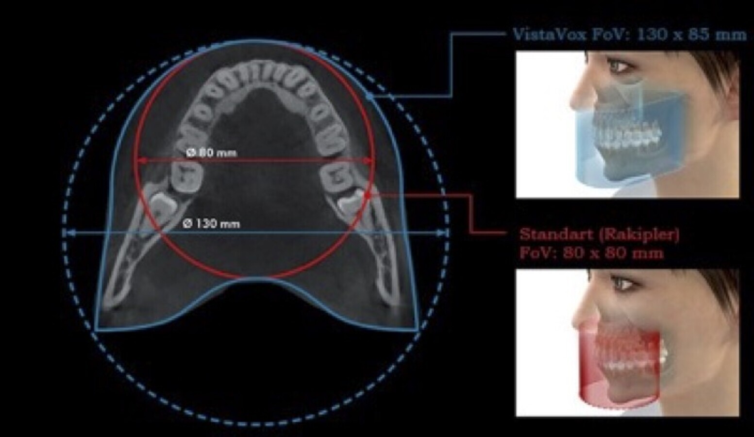 Dürr Dental CBCT görüntüleme sistemi VistaVox, yüksek görüntü kalitesini düşük radyasyon dozuyla kombine eder. Bu özelliği, anatomik hacim adaptasyonu uygulayarak sağlar. Yani ‘Dental FoV’ konsepti ile diş hekimliğinin odaklandığı hacmi görüntülemeyi hedefleyerek gereksiz radyasyon yayılımını engeller. Dental FoV değeri 130*85 mm olan VistaVox, 50*50 mm FoV değeriyle 80 µm çözünürlükte bölgesel çekim yapma imkanı sunar. Işığa duyarlı Csl sensör (piksel boyutu: 49,5 µm) teknolojisi kullanılan sistem güvenilir teşhisler yapabilmeniz, kesin temelli tedavi kararları alabilmeniz ve hastanızla ikna edici bir iletişimde bulunabilmeniz için ihtiyaç duyduğunuz tüm detayları size sunar.