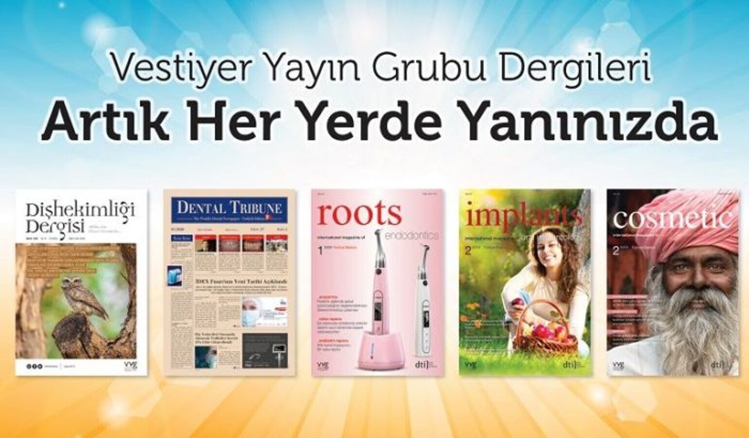 Türkiye’de diş hekimlerine özel yayıncılığın öncüsü Vestiyer Yayın Grubu (VYG), 30 yılı aşan dergicilik tecrübesini yeni mecralara taşıyarak dijital yayıncılığın konforunu okurlarıyla buluşturuyor. Artık 5 farklı yayın, e-dergi formatıyla bulunduğunuz her yerde yanınızda olacak. E-dergi’ye geçişin en büyük avantajı ise okurların 10 yıllık dergi arşivine ulaşabilmesi.